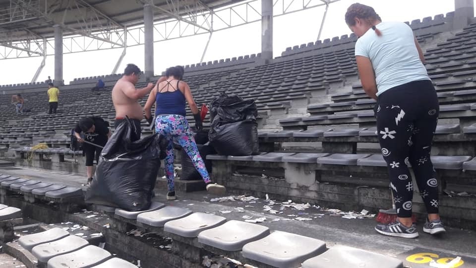 El primer caso ocurrió en el estadio Hernán Ramírez Villegas, el lunes y martes de la semana pasada. Integrantes de la barra Lobo Sur del Deportivo Pereira, de los sectores de La Victoria Centro, Las Brisas, Los Sauces y Cuba, conformaron un equipo de trabajo que se encargó de la limpieza de la tribuna Sur, en la cual quedaron los restos de la animada presencia de hinchas matecañas en el clásico ante Once Caldas.