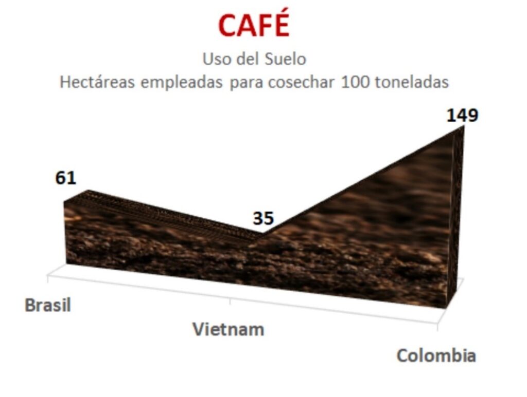 De acuerdo con los datos proporcionados por FAO 2021 (última estadística disponible), Colombia rindió en promedio 0,67 t/ha (83,75 cargas, o sea, dos y media veces menos de la productividad de Brasil y la cuarta parte de la de Vietnam), lo cual resulta en un enorme impacto ambiental si se tiene en cuenta que para cosechar 100 toneladas (800 cargas) de café, Vietnam emplea 35 hectáreas, Brasil 61 y Colombia 149 ha. HUELLA ECOLÓGICA. Véase el siguiente gráfico: