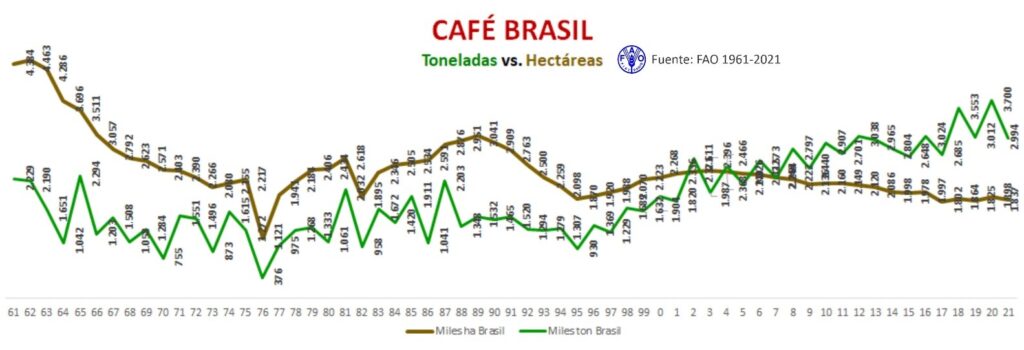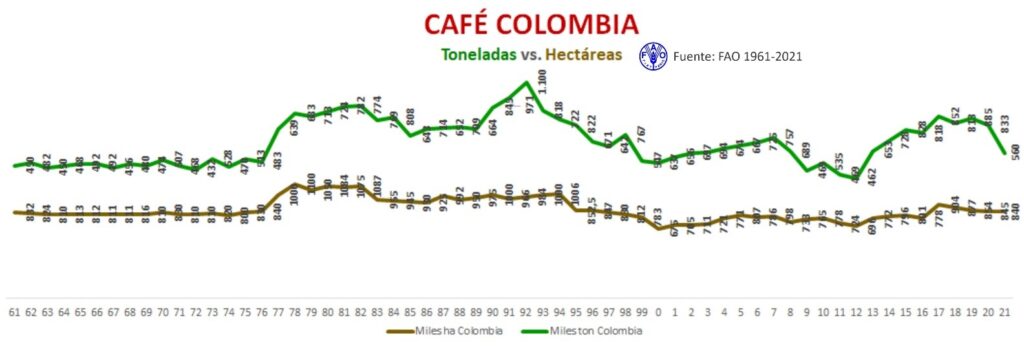 El comportamiento de la producción cafetera estos últimos 60 años, 1961-2021, demuestra que Colombia comenzó a ver amenazada su condición de país cafetero desde 1986 cuando Vietnam registró un rendimiento de 1.31 t/ha mientras Colombia se quedó en 0,77 t/ha y luego en 2004, cuando Brasil elevó su productividad a 0,96 t/ha quedando Colombia rezagada en 0,83 t/ha. De ahí en adelante los rendimientos colombianos se han mantenido muy bajos: de 2005 en adelante esta es la relación (izquierda Colombia, derecha Brasil): 0,83/0,92; 0,92/1,11; 0,95/0,99; 0,94/1,26; 0,61/1,14; 0,69/1,35; 0,65/1,26; 0,66/1,13; 0,85/1,42; 0,92/1,40; 1,03/1,34; 1,05/1,51; 0,94/1,49; 0,93/1,91;1,04/1,65; 0,99/1,95 y 0,67/1,63 t/ha. Véase este gráfico: