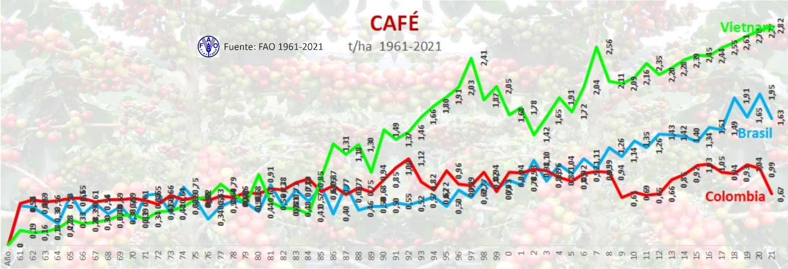 El comportamiento de la producción cafetera estos últimos 60 años, 1961-2021, demuestra que Colombia comenzó a ver amenazada su condición de país cafetero desde 1986 cuando Vietnam registró un rendimiento de 1.31 t/ha mientras Colombia se quedó en 0,77 t/ha y luego en 2004, cuando Brasil elevó su productividad a 0,96 t/ha quedando Colombia rezagada en 0,83 t/ha. De ahí en adelante los rendimientos colombianos se han mantenido muy bajos: de 2005 en adelante esta es la relación (izquierda Colombia, derecha Brasil): 0,83/0,92; 0,92/1,11; 0,95/0,99; 0,94/1,26; 0,61/1,14; 0,69/1,35; 0,65/1,26; 0,66/1,13; 0,85/1,42; 0,92/1,40; 1,03/1,34; 1,05/1,51; 0,94/1,49; 0,93/1,91;1,04/1,65; 0,99/1,95 y 0,67/1,63 t/ha. Véase este gráfico: