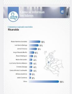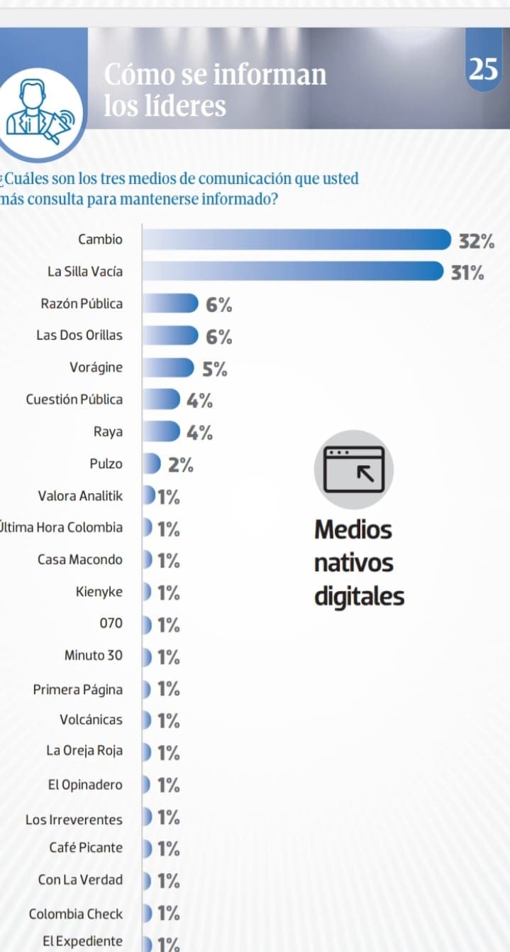 Los dos primeros lugares los ostentan la revista Cambio y la Silla Vacía con un 32% y un 31% respectivamente. Razón Pública y Las Dos Orillas, ambos de gran renombre nacional obtuvieron un 6 por ciento, ubicándose en el tercero y cuarto lugar respectivamente. Más adelante se encuentra Vorágine con un 5%, periodismo fresco, moderno y atractivo diseño.