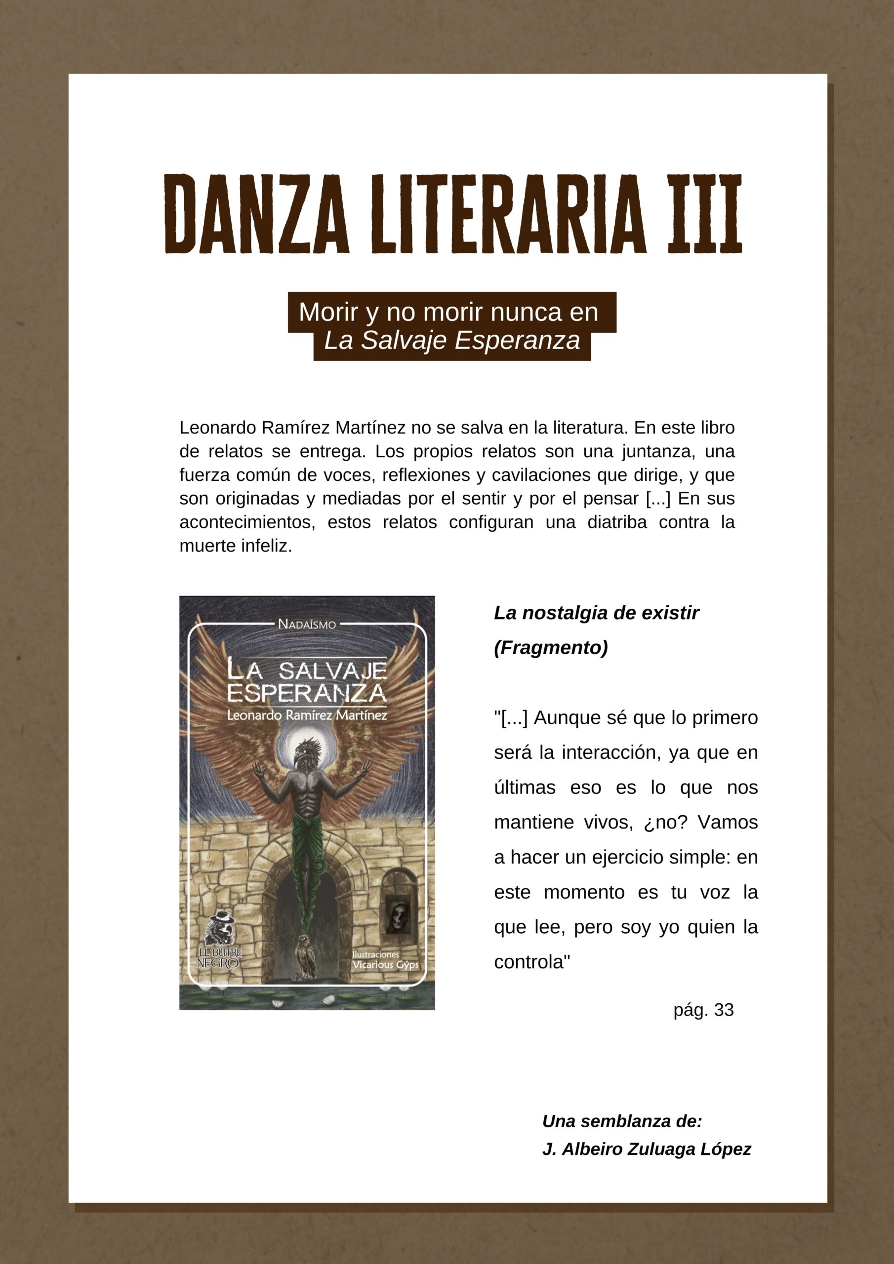 Leonardo Ramírez Martínez no se salva en la literatura. En este libro de relatos se entrega. Los propios relatos son una juntanza, una fuerza común de voces, reflexiones y cavilaciones que dirige, y que son originadas y mediadas por el sentir y por el pensar. En su largo, sin dejar nunca de estar implicado, pues sus mismos personajes llegan a exponerlo sin ningún miramiento, se opone enérgicamente a la sistematización de la vida que hace de la misma una habitación estrecha y sin muebles. Aún en su rechazo al rebaño y sus insumos, no se margina, se afirma en el centro de los vivientes, haciendo de su cotidianidad y de la fuerza vital nadaísta una arenga contra el capitalismo, órgano económico perseguidor y anulador de ontologías. Como a la vida que se coarta, cuestiona a esa muerte moral en que deviene.