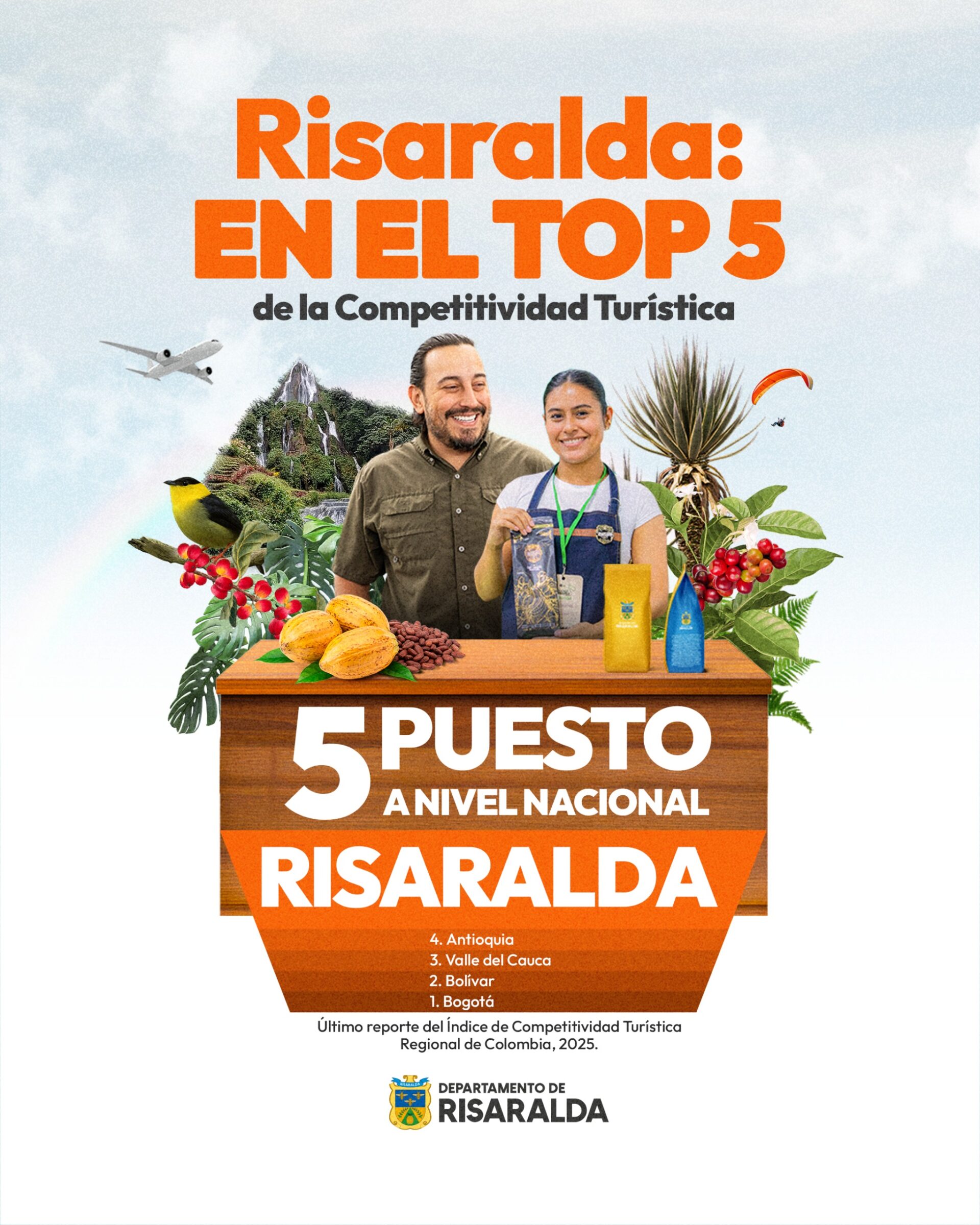 Risaralda se consolidó como uno de los destinos más competitivos de Colombia al alcanzar el quinto lugar en el Índice de Competitividad Turística Regional 2025, con una calificación de 5,74 sobre 7, equivalente al 82 % del puntaje máximo posible. El anuncio fue realizado por el gobernador Juan Diego Patiño Ochoa durante la Vitrina Turística de ANATO.