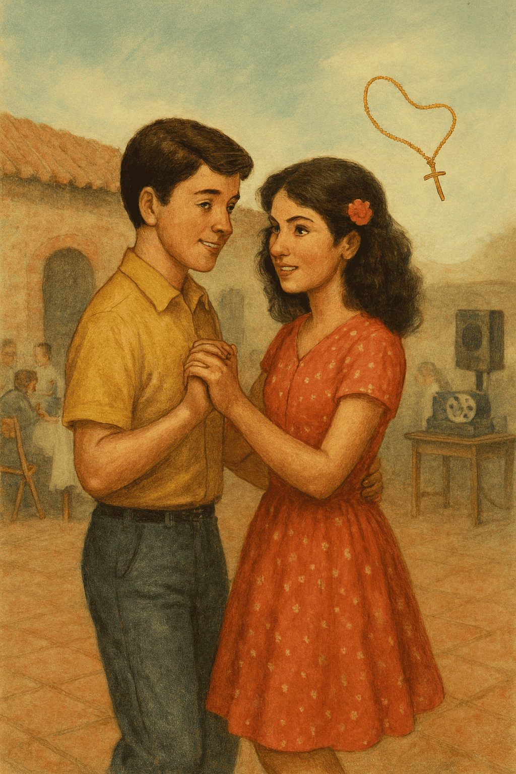 Se llegó el día de la fiesta. El patio de la casa cural tenía mesas tipo salón de bingo con mantel blanco e incómodas sillas plegables de madera que solíamos llamar aplana nalgas. El padre dispuso dos cornetas de amplificación para la música y la venta de empanadas con gaseosa. Trago no se vendía porque iban muchos jovencitos como yo (no se rían por favor). Allí llegué con mi primo Jaimico (leyó bien, no es Jaimito, sino Jaimico) y ella llegó con su prima Cristi, que por supuesto corresponde a Cristina. En un momento de suma incomodidad le dije a mi primo quién era mi verdadera novia y ella le tuvo que decir a su prima que yo era su novio. Finalmente, mi primo y la prima de mi novia se saludaron y se sentaron con nosotros en una de las mesas. Pedimos una bandeja de empanadas y gaseosas y entonces el que ponía los discos, rodó un casete con el estreno del momento: “Se me perdió la cadenita” en la voz de Lucho Argaín y la Sonora Dinamita. Era el año 1978. Entonces le pedí a ella que saliéramos a la pista de baile y temblorosos los dos, llegamos al centro del patio parroquial y por primera vez sentí el cuerpo de una mujer cerca de mí. Por su puesto también fue la primera vez que bailé con una chica real. Ella me dijo al oído que estaba nerviosa. Bailamos y fuimos felices.