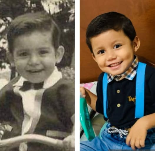 Buscando en las raíces, una primogénita encontró unir dos fotografías para construir una bella conexión solo comparativa, circular, móvil, alegre, simpática, tierna-tierno, pasado-presente, grande-pequeña, profunda, lúdica, evocadora, de luz entre el abuelo (padre) y su nieto (hijo), encontrando una precisión que provoca la magia.